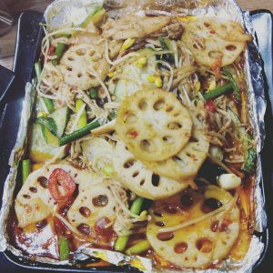 这时候备菜☞我喜欢的豆芽,藕片,土豆片,黄瓜片,蒜薹,金针菇☜(主要看烤盘大小准备哟)