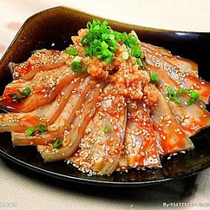 五花肉拿出切片摆盘,中间放点葱丝点缀,或者是青瓜丝也可以