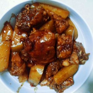 待排骨水快烧干,加入土豆,翻炒均匀。继续加水煮10分钟左右即可。