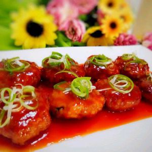 大火收汁,淋明油,丸子摆盘,汤汁淋在丸子上,用水泡过的葱丝装饰。