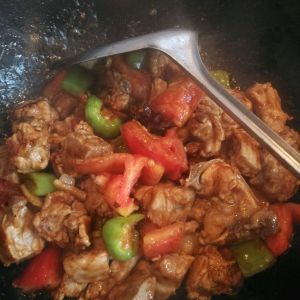 热油,烹葱姜蒜,加入排骨,爆炒,之后加入番茄和青椒继续炒3分钟