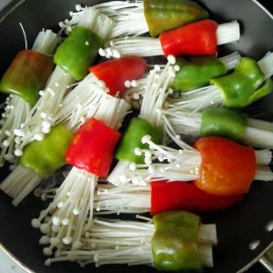 尽可能的选用窄点的青椒底部,这样后面做的时候金针菇不会滑出来。