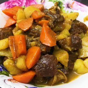 中间步骤忘了拍照,下次做再补上,胡萝卜,土豆切滚刀块,起热锅,加稍微多点的油,把土豆胡萝卜炒一下,土豆看到大面积变得有些透亮以后再加入炖好的牛肉和牛肉汤,也可以加入适量的开水,根据汤色再添加适量老抽,加入适量盐,汤要稍微咸一点,蔬菜才能入味,炖至土豆可以用筷子戳透,就可以出锅了