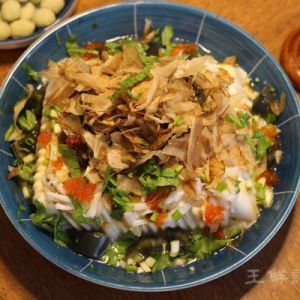撒上葱花,蒜末,香菜末,鱼子,最后铺上柴鱼花,这道和风银鱼皮蛋豆腐就完成了