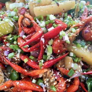 开盖放入适量鸡精味精生抽起锅装盘撒上白芝麻,葱花。开吃。。。(因为小龙虾有壳不好入味,要多放少许盐,有时间最好装盘后放置十分钟后再吃更入味)。