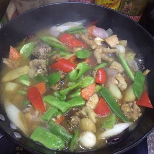煮沸放豆角中火盖盖焖 软了之后放彩椒 在放面收汁 咕嘟咕嘟咕嘟几下ok➕点鸡精撒葱