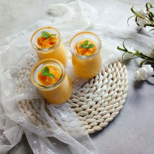 冷藏3小时以上,食用前在布丁上面放些芒果丁和薄荷作为装饰。