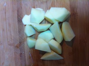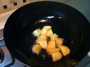 铁锅上灶烧热放油烧五成热放土豆煎黄捞出