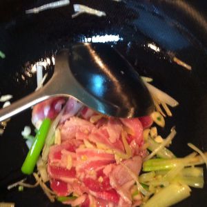 锅留底油烧热放葱姜蒜炒香放五花肉煸炒变白放生抽和胡椒粉适量炒香