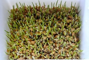 将小麦用大概20度的温水稍稍浸泡30-60分钟,带孔篮子下面垫一层厨房纸巾,将泡好的小麦均匀的倒在里面铺平,放置在厨房的台面上(漏水下面可以用盘子接住),每几个小时用花洒均匀的喷一遍水。
