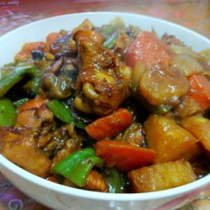 放上油,花椒,冰糖鸡肉,耗油,老抽,豆瓣酱,白醋,啤酒,水大火煮10分钟到入胡萝卜和土豆。