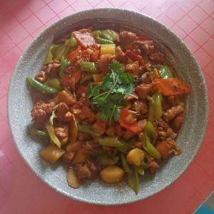 鸡剁成块用水泡出血沫,青椒 胡萝卜切片,土豆切块。
