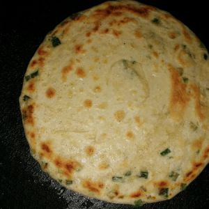 用刷子把油酥均匀的刷在面皮上并均匀的洒上葱花。