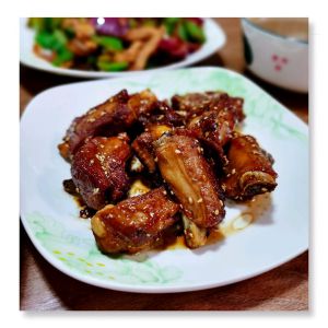 排骨洗净控干水,锅内放油姜片炝锅,加入排骨,翻炒至焦黄