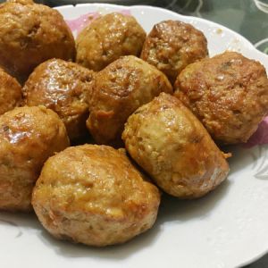 将拌好的肉揉成等大的肉丸,沾上打好的鸡蛋(全蛋1个),入油锅,炸至两面金黄。