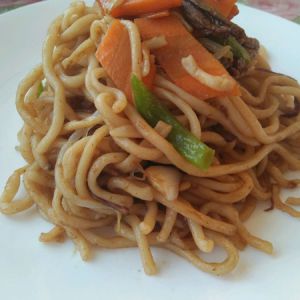 加入苗条,咸盐,老抽,生抽。,不停的搅拌,直到所有面条都均匀的上色。
