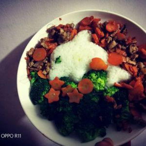西蓝花,烫熟摆盘,米饭用模具按压到盘子,盛出菜放在周围!吃饭啦~
