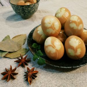 锅内另加适量水,加入茶叶,煮开茶叶后,放入八角、花椒、香叶、桂皮、小茴香、生抽、老抽、冰糖、盐,放入鸡蛋,大火煮开后转小火煮5分钟。关火后浸泡一晚。