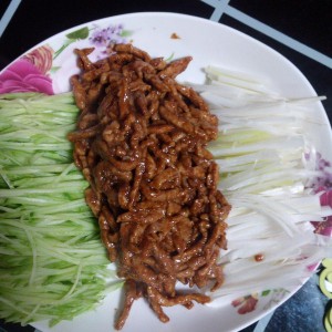 3.下面就是最后一步了炒酱咯,锅里倒点花生油,油热后我们可以先转小火炒甜面酱(因为酱容易糊锅底所以我们要小火炒)炒到面酱冒小泡了把刚刚我们炒好的肉丝倒进锅里让每个肉丝上都沾上甜面酱,ok咯出锅成在我们的提前装盘的黄瓜葱丝上