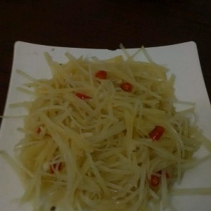把烫好的土豆丝到入,放入盐、鸡精、白米醋(动作要快点)翻炒均匀之后可口又开胃的酸辣土豆丝就做好啦!!