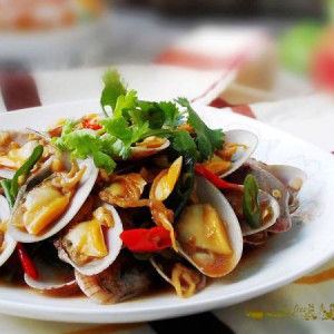 倒入花蛤炒熟,如果是整个花蛤,炒至全部开壳;