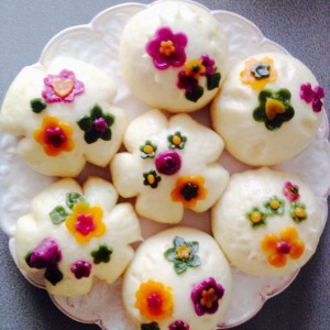 之后,安装花朵要时在馒头顶或花朵底部刷水