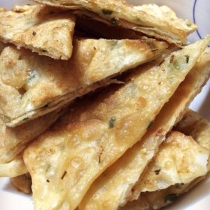 面分成小剂子,擀开,抹上葱白油,撒上葱绿