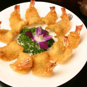 把虾裹上蛋液,再裹上长面包糠,重复3次(注意:虾尾不要裹)下锅炸