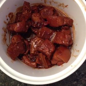 放料酒 老抽 加少许醋去腥 翻炒 少许白糖 加入豆腐乳