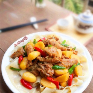 面条铺在盘中,再把鸡肉浇在面上面,欧了,可以起筷。