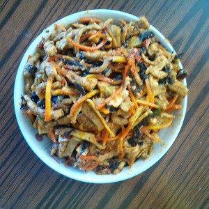 然后再将萝卜丝,木耳丝放入锅中一起翻炒…待七分熟后加入炒好的肉丝,倒入醋,糖加少许盐!即可出锅!