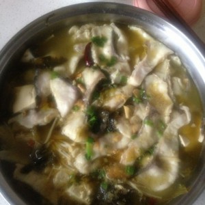 另起油锅放入花椒,蒜片,辣椒,在锅内放上香葱将热油浇上,香喷喷滑嫩的酸菜鱼出锅啰