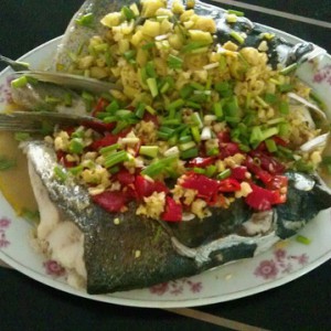刚刚炒姜蒜末的油均匀抹在鱼身上,里外都抹,待蒸锅内水开后把鱼头放入蒸三分钟,然后端出倒掉腥水,再把切好的青红剁椒撒在鱼头两边,把刚刚炒好的姜蒜末撒在剁椒上面,重新放入蒸锅!