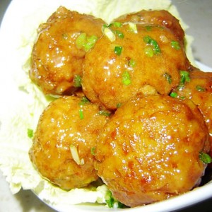 取适量肉碎,搓成圆形,在入锅炸之前在表面淋上淀粉水