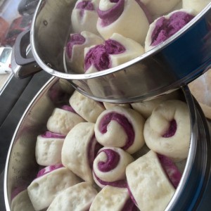 发酵好的面团兑入一定量的碱面,反复揉,直到把碱面和面揉匀。用一小块白面团擀开,紫薯面团擀开,两块面团叠加起,卷成卷,用刀切开。或者把紫薯面团包入白面团里,像包包子一样,再在顶部用刀切个十字。