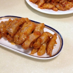 每一块猪里脊都沾到醬的时候,把水淀粉倒进去,继续翻炒几下,关火。