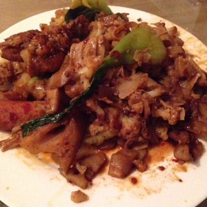把腌制好的鸡翅小火煎炸。然后倒入准备好的食材混入麻辣香锅得酱翻炒。可以加一些水,不然酱料太咸太辣