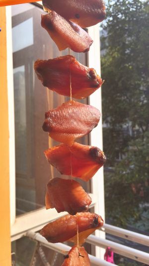 7天后把鸡翅用绳子串起,放在室外晒干,太阳大的话,三四天就可以晒成如图,油亮翻红,便OK了,吃时用冷水洗净,放入锅中蒸20分钟左右就好了