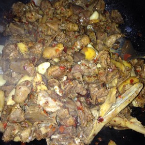 不断翻炒后,水开始涨,放入大蒜、土豆(香菇)。市场翻炒。