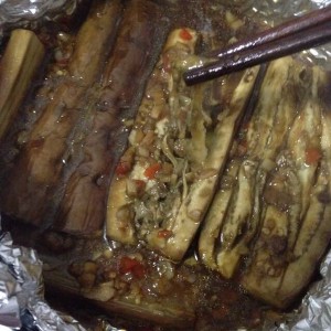 吃的时候把茄子翻过来。吃里面的茄子肉