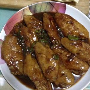 用煎鸡翅的油放入姜,葱爆香,把鸡翅放入锅中,放少量十三香,酱油炒匀,把可乐倒入,加入少量盐和老抽,糖,盖上锅盖,开中火,中间一定要勤翻炒,要不很容易糊掉,把汤汁收干,加少量鸡精,装盘OK.