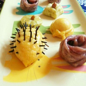 用黄色的搓成了小草帽和刺猬。刺猬的刺是菰米哦,好形象啊哈哈
