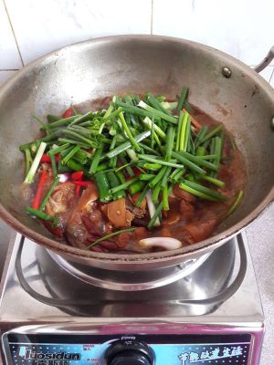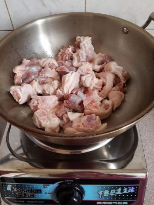坐锅烧热下油爆香姜蒜出香味。小火放猪蹄下去翻炒2分钟。炒到肉皮缩紧。