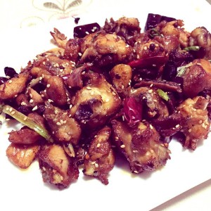 另起一鍋,將剛才炸雞塊的油倒入一點在鍋內,然後加入辣椒,大蒜,花椒,生薑一起煸炒,炒出香味後加入雞塊繼續翻炒,然後加糖,生抽,當中加一點點水,最後加入葱,芝麻