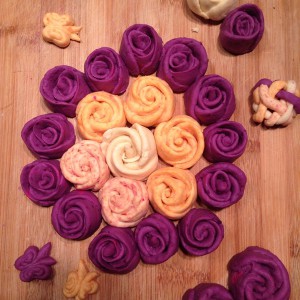 我的这次和的太稀,管他了,搓5个圆坨,另外拿个保鲜膜,(水果塑料袋也行)把圆坨放进去用手掌一压,就是一个圆皮。如图,然后裹起来就是一朵玫瑰花了。这样做起来很快速!