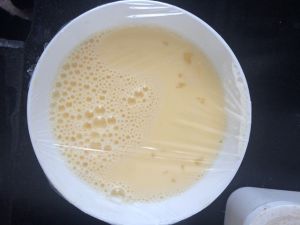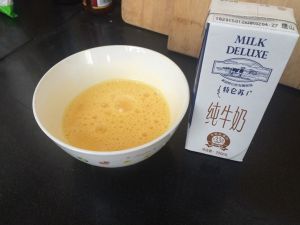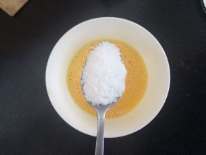 鸡蛋打成液,加两勺白糖,搅匀