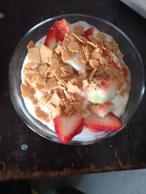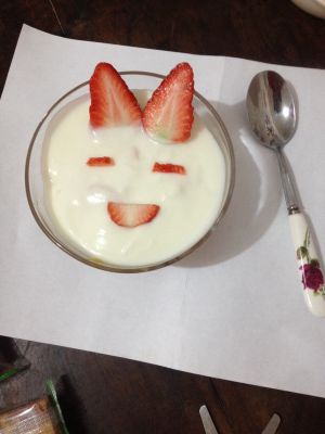 加了酸奶的碗轻微上下震动使酸奶更平整 用草莓装扮图案就行 这碗是宝宝的