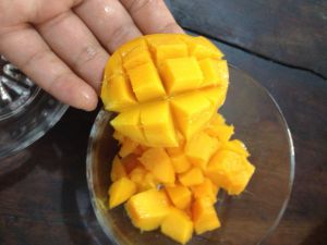 芒果从中间切两半注意用刀安全哦 切成如图那样方便取果肉