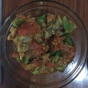 用少量油把葱和姜、青椒先炒半熟,放西红柿翻炒,在放煎好的茄子!就好了
