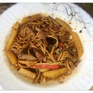 边炒菜时可以边煮面条,熟后倒入炒好的菜里,加点老抽调色出国就OK啦!